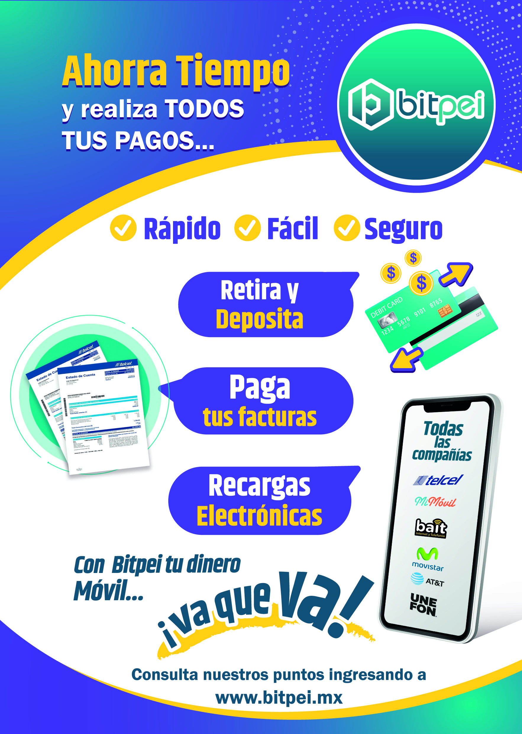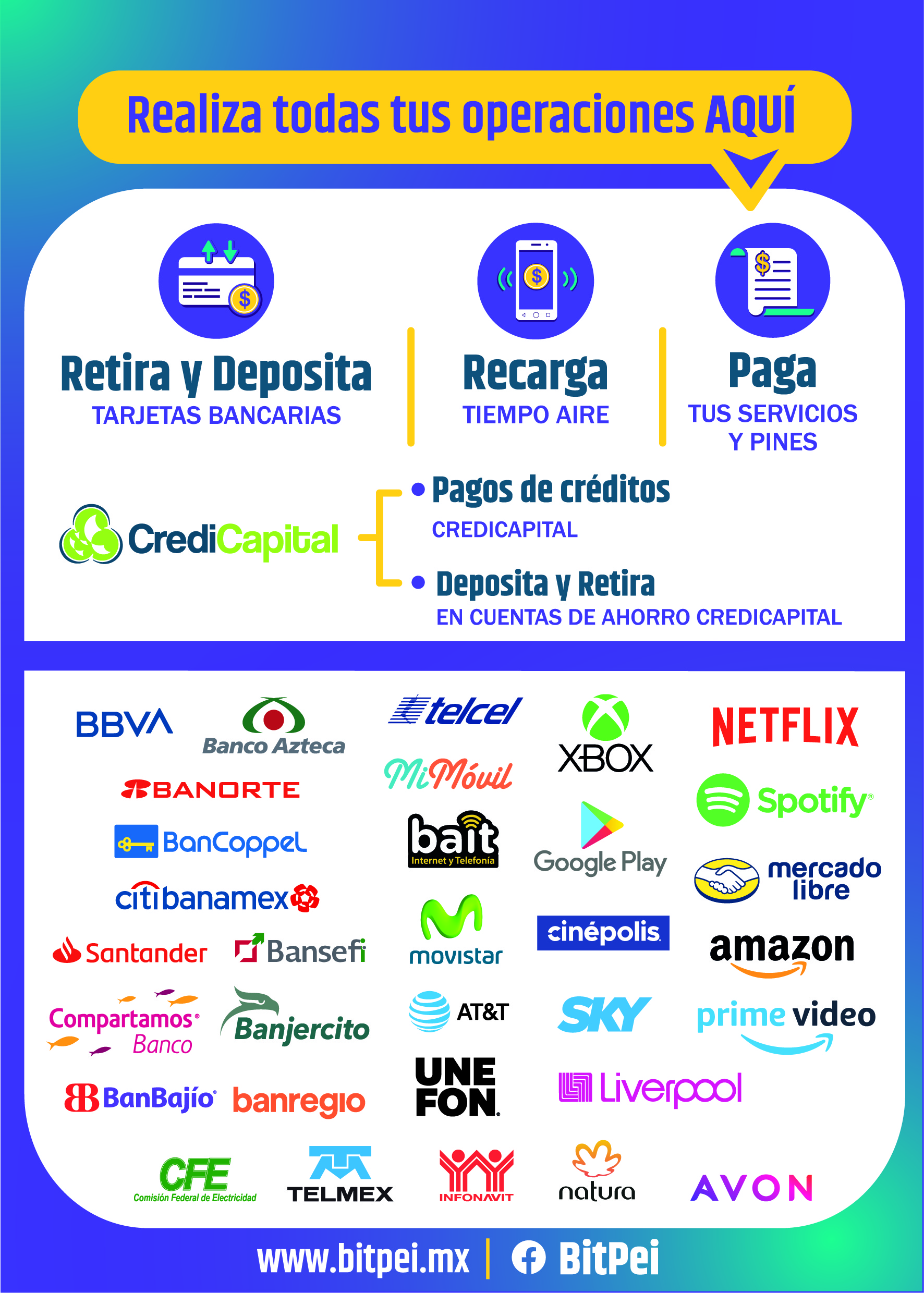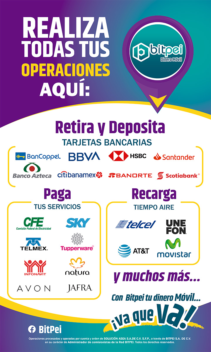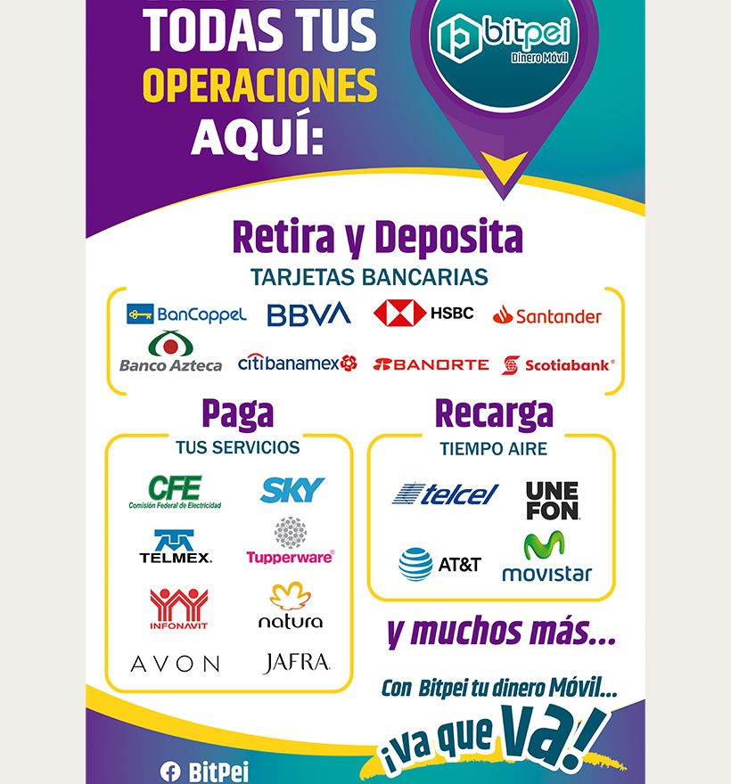BitPei pone a tu disposicion recursos en formato PDF para impresión para que puedas colocarlo en tu negocio o archivos JPG que puedes utilizar para tus estados en tus redes sociales.